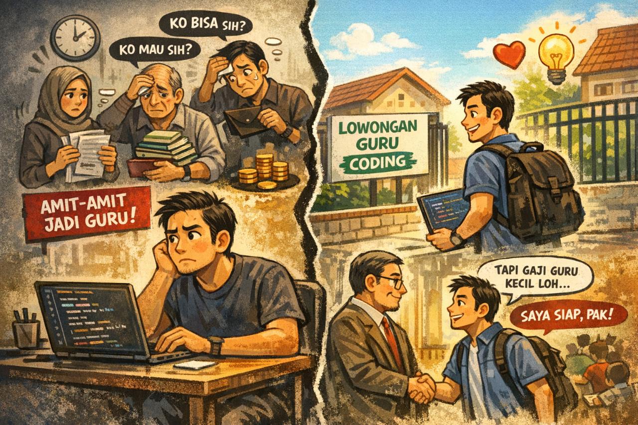 Kalau soal uang atau gaji guru, sebetulnya dari awal gua sudah aware. Bahkan bisa dibilang terlalu sadar. Gua punya banyak teman yang berprofesi sebagai guru, dan jujur aja, sering kali ketika denger cerita mereka, refleksi pertama gua bukan kagum, tapi heran. Heran yang jujur. “Ko bisa sih?” “Ko mau sih?” Bukan dalam arti merendahkan, tapi lebih ke rasa tidak habis pikir. Dari cerita tentang beban kerja, tuntutan moral, ekspektasi sosial, sampai urusan gaji yang—ya kita sama-sama tau—kadang bikin geleng kepala. Sampai pada titik gua sering mikir, setengah bercanda setengah serius: amit-amit jangan sampai terjerumus ke sana. Dan anehnya, semua pandangan itu buyar begitu saja ketika suatu hari gua lihat postingan lowongan kerja di sekolah: guru mata pelajaran coding/pemrograman. Niat gua waktu itu sebenarnya sederhana. Bahkan kalau mau jujur, agak egois juga: “Gua mau supaya skill gua nggak tumpul.” Karena gua tau, salah satu cara paling efektif untuk menjaga pemahaman adalah dengan mengajar. Ketika lo mengajar, lo dipaksa ngerti, bukan sekadar bisa. Lo dipaksa menjelaskan, bukan cuma mengerjakan. Bonusnya, ya gua anggap sebagai amal buat akhirat. Dua niat ini ketemu di satu titik. Dan dari situlah keputusan itu lahir. CV gua kirim. Satu minggu kemudian, masuk WA undangan interview. Besoknya gua datang ke sekolah. Interview-nya… jujur aja, kurang mirip interview pada umumnya. Lebih mirip ngobrol santai, bahkan terlalu santai. Kalimat pembuka yang gua terima bukan pertanyaan kompetensi, tapi: “Gimana ceritanya ko bisa ngelamar jadi guru? Ko bisa tau ada lowongan guru dari siapa?” Nada bicaranya akrab, seperti ngobrol sama teman lama. Gua jawab jujur: tau dari teman yang posting di story WhatsApp. Lalu gua lanjut jelasin latar belakang gua: S1 Teknologi Informasi dari UNIPI, kerja di startup kecil di Kota Tangerang, pernah ikut beberapa bootcamp pemrograman, dan secara kapasitas gua yakin bisa mengajar mata pelajaran pemrograman, termasuk menyusun silabus dan alur pembelajaran. Belum selesai gua cerita, dia motong. Topiknya langsung loncat ke gaji. “Tapi gini pak, bapak mungkin udah pernah denger kalau gaji guru itu kecil. Itu beneran pak. Bahkan kadang kalau dari dinas turunnya telat, gaji juga ikutan telat, karena kita ngandelin dari dinas.” Di kepala gua sempat nyempil pikiran: ini kan sekolah swasta, masa sepenuhnya ngandelin dinas? Tapi yaudahlah, gua iyain aja. Gua jawab tenang, bahwa sebelum ke sini gua sudah tau realitas gaji guru. Banyak teman gua guru, gua sering ngobrol soal itu. Dan gua jelasin dengan jelas: gaji bukan prioritas gua. Ketika gua memutuskan masuk dunia pendidikan dan jadi guru, artinya gua sudah siap dengan konsekuensi, termasuk bayaran kecil.