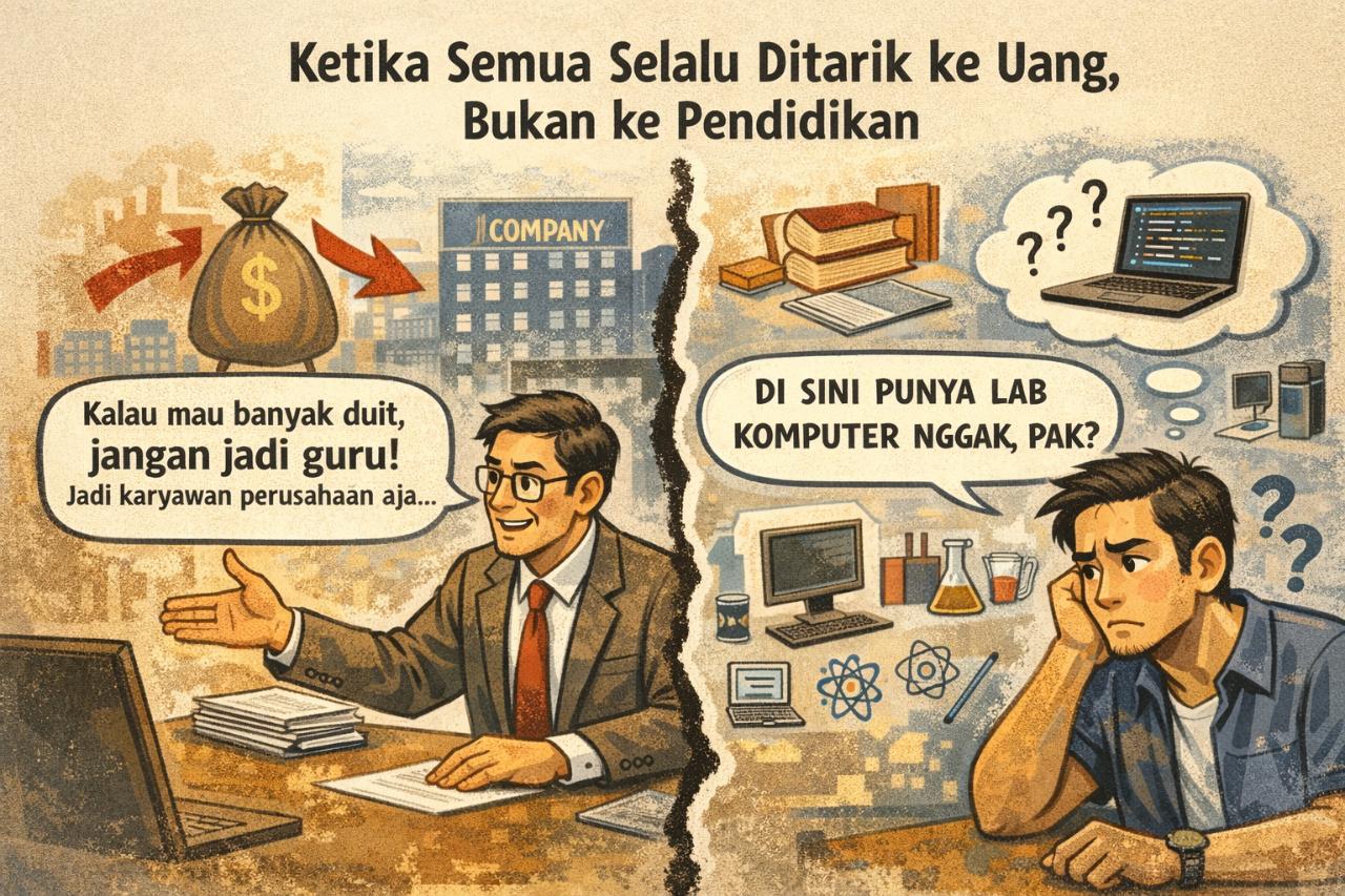 Seperti layaknya interview, gua lanjut jelasin lagi dan lagi bahwa gua capable. Bahwa gua ngerti apa yang akan gua ajarkan. Bahwa ini bukan keputusan impulsif. Tapi lagi-lagi, pembicaraan dipotong dan ditarik ke arah yang sama. “Iya pak, dari CV bapak ini sebenernya udah sesuai banget. Tapi ya itu pak, gaji di sini kecil. Di pendidikan memang begini pak. Di semua sekolah juga sama. Jadi kalau mau banyak duit, jangan jadi guru. Jadi karyawan perusahaan aja. Sekolah kan nggak kaya perusahaan yang orientasinya uang.” Di titik ini, jujur aja, gua mulai ngerasa nyebelin. Bukan karena gaji kecilnya—itu sudah beres dari awal. Tapi karena kenapa topik yang sudah clear terus-terusan diulang? Di kepala gua cuma ada satu pikiran: kalau gua ngejar duit, ngapain juga gua ke sini? Tapi ya gua tetap jaga sikap. Tetap ramah. Tetap profesional. Sampai akhirnya gua nanya satu hal yang menurut gua paling krusial. Satu-satunya pertanyaan penting yang gua ajukan sepanjang interview itu. “Di sini kita punya lab komputer nggak, pak?” Gua tekankan kenapa gua nanya itu. Karena ini bukan fasilitas tambahan. Ini kebutuhan primer. Mata pelajarannya coding. Tanpa lab komputer, mau ngapain? Mau ngajarin apa? Teori doang? Jawabannya singkat. Pendek. Dingin. “Iya, kita punya lab di atas.” Habis itu? Topiknya balik lagi ke gaji guru. Di titik itu gua udah capek secara mental. Bukan capek debat, tapi capek karena arah pembicaraannya jelas. Fokusnya bukan pada bagaimana pembelajaran dijalankan, tapi bagaimana guru menyesuaikan diri agar sistem tetap tenang dan tidak merepotkan. Dan mungkin, di situlah benih-benih keanehan itu mulai terasa. Bukan karena sekolahnya jahat. Bukan karena orangnya berniat buruk. Tapi karena sejak awal, yang mereka bicarakan bukan pendidikan, melainkan pengelolaan guru. Bukan pembelajaran, tapi ketertiban. Bukan kualitas, tapi risiko. Dan saat itu gua belum sepenuhnya sadar, tapi sekarang gua paham: di situlah awal dari semua konflik nilai yang muncul belakangan.